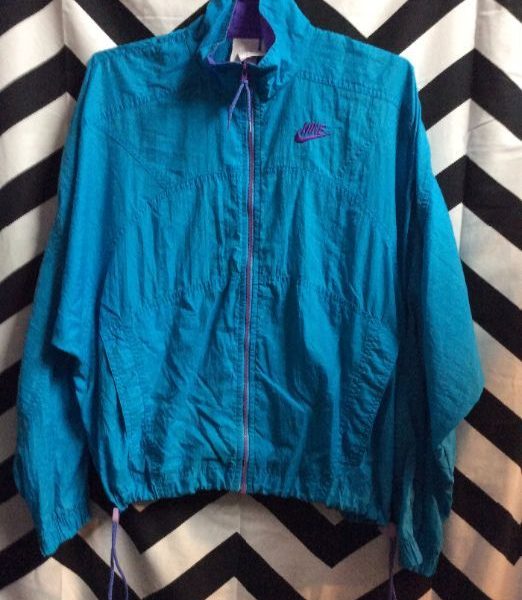 Nike windbreaker, zip-up, embroidered logo left chest, turq/purple, size S small fit