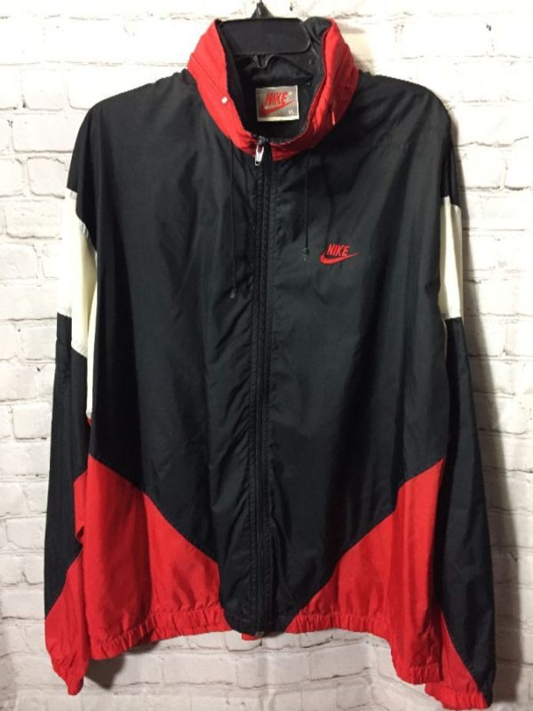 NIKE WINDBREAKER JACKET, ZIP-UP, HIDEAWAY HOOD, GRAY TAG, JORDAN ERA, COLOR-BLOCK DESIGN, EMBROIDERED FRONT CHEST LOGO, BLACK/RED/WHITE, SIZE XL