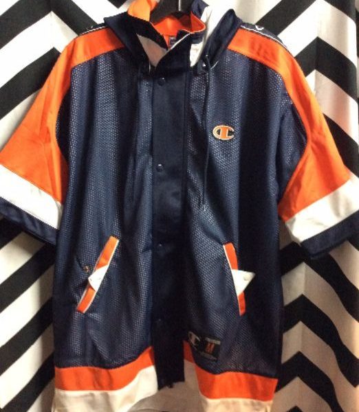 1990’s Champion sports jersey, hooded, short sleeves, button-up, mesh, deadstock, new with tag, navy/orange/white, size M