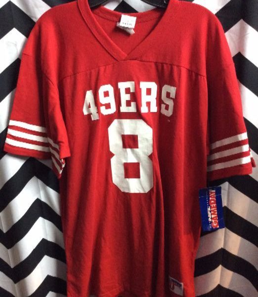 Football jersey, cotton, 49er’s, Steve Young #8, deadstock, NWT, red/white, size L