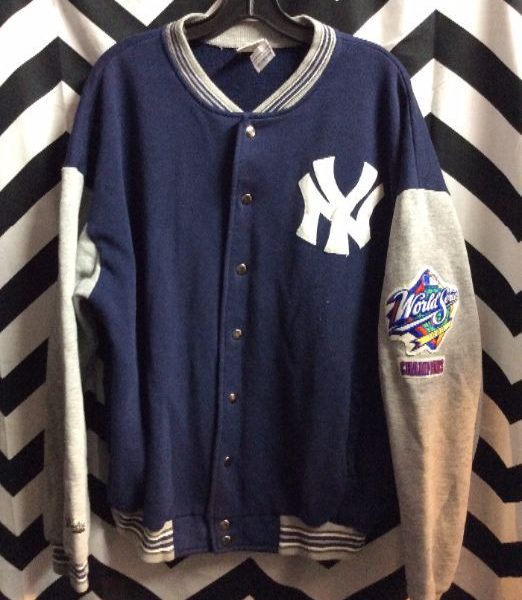 1998 sports sweatshirt jacket, button-up, NY Yankees, applique logo, World Series patch, navy/gray, size XXL as is