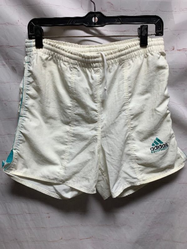Adidas Equipment shorts, nylon, running style, elastic waist, stripes down sides, embroidered left leg logo, white/turquoise/black, size M