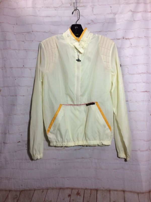 Style Auto windbreaker racing jacket, nylon, pullover, 1/2 zip-up, hideaway hood, 2 front pockets, contrasting trim on neck and pockets, horizontal stripe connecting top of pockets, quilted fabric on shoulders, embroidered logo shoulder patch, elastic at cuffs & hem, off white/yellow/red, size XS