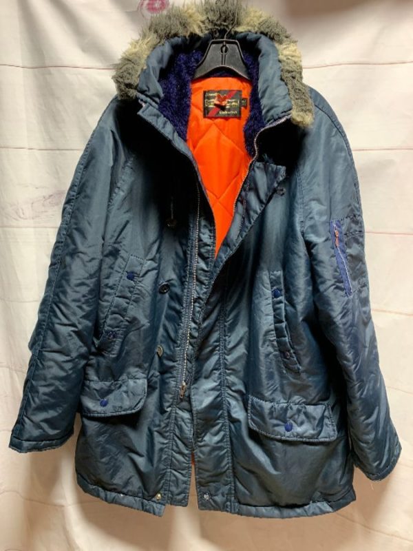 CLASSIC SEARS PARKA, NYLON, ZIP-UP, HOODED, CONTRASTING COLOR LINING, BLUE/ORANGE, SIZE XL AS IS