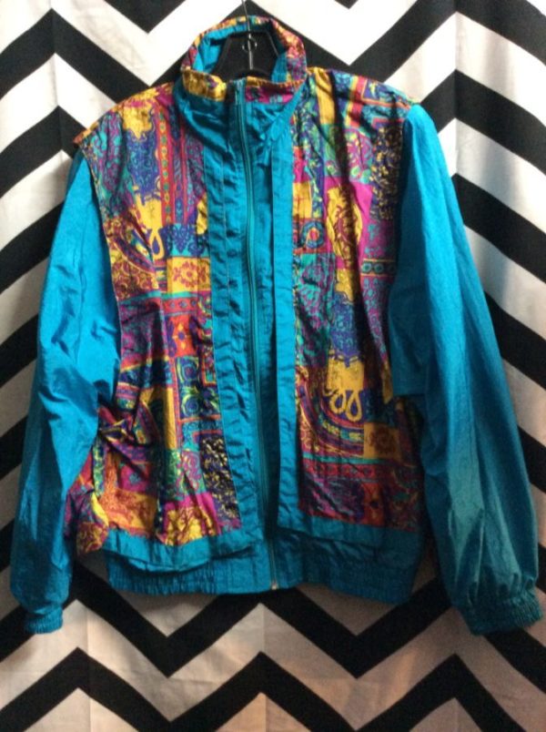 Windbreaker jacket, zip-up, nylon, Baroque design with Paisley pattern, teal/pink/multi, size M