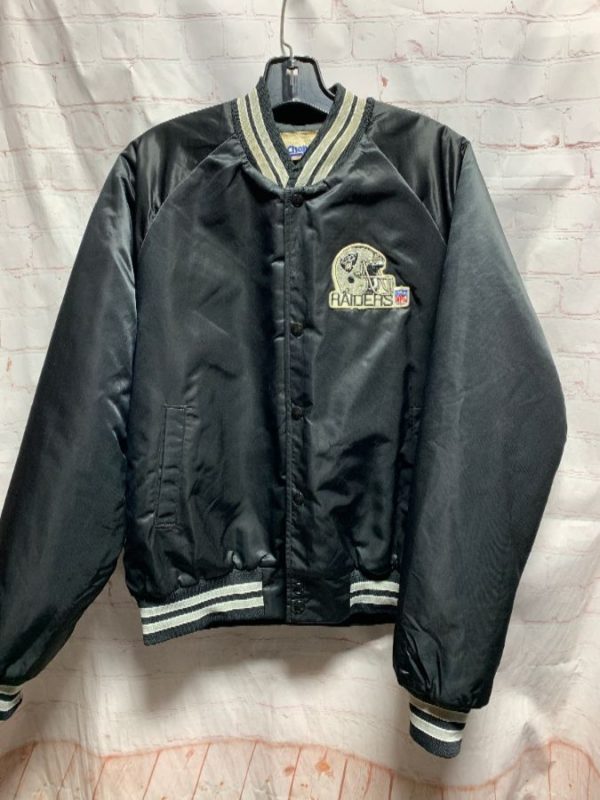 CHALK LINE SPORTS JACKET, SATIN, SNAP-UP, STRIPED TRIM ON NECK/CUFFS/HEM, EMBROIDERED LEFT CHEST TEAM LOGO WITH HELMET, NFL, BLACK/SILVER, SIZE L