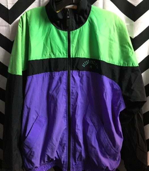 Ocean Pacific windbreaker jacket, zip-up, color block design, neon-color, green/purple, size M