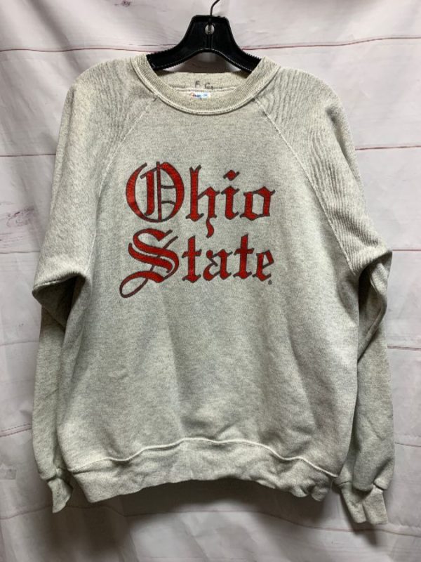 HANES SWEATSHIRT, 50/50 COTTON/POLYESTER, PULLOVER, CREW-NECK, OHIO STATE, OLD ENGLISH FONT, SCREEN PRINTED LETTERING, GRAY/RED, SIZE XL AS IS