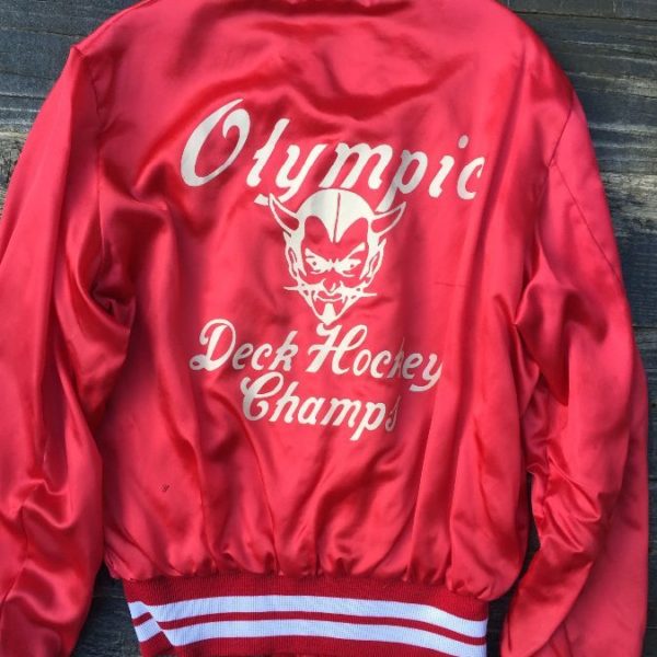 Sports jacket, satin, snap-up, Olympic Deck Hockey Champs, screen printed lettering and devil graphic, striped trim, red/white, size L