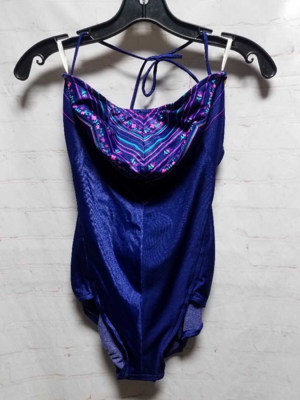 Bathing suit, one piece, spaghetti straps that tie, French cut legs, low back, fastens in back, floral & chevron print across bust, pink/purple/blue/teal
