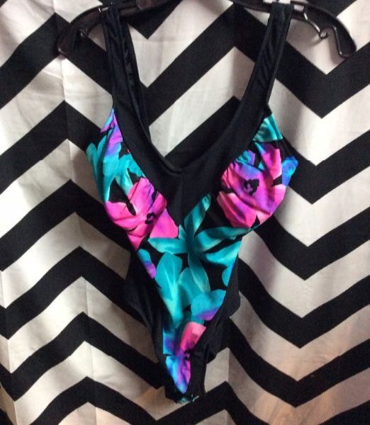 BATHING SUIT, ONE PIECE, FLORAL PRINT, FRENCH CUT LEGS, BLACK/PINK/TEAL/PURPLE, SIZE L