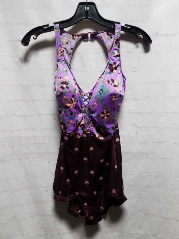 Bathing suit, one piece, built in bra, plunging neckline to waist with lace-up look front, low cut back that hooks at top, boy-cut legs, two prints in color-block design, floral design top & little half moon print on bottom, purple/pink/brown/teal, size 12