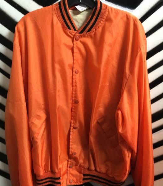 Riversedge Bar satin baseball jacket, button-up, screen printed full back design, orange/black, size L
