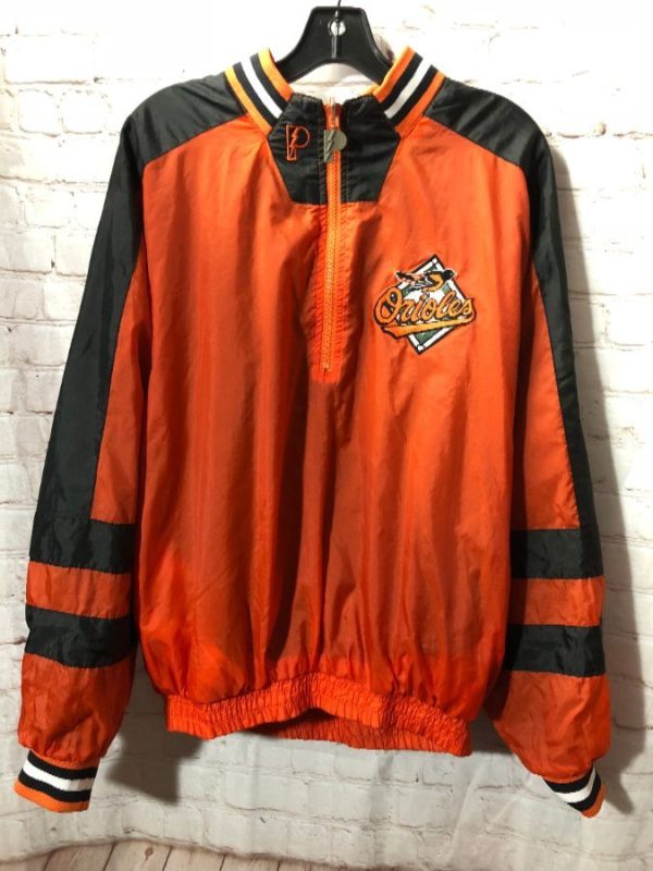 Windbreaker jacket, pullover, half zip-up, reversible, Baltimore Orioles, color block design, striped sleeves, embroidered logos both sides, orange/black/white, size M