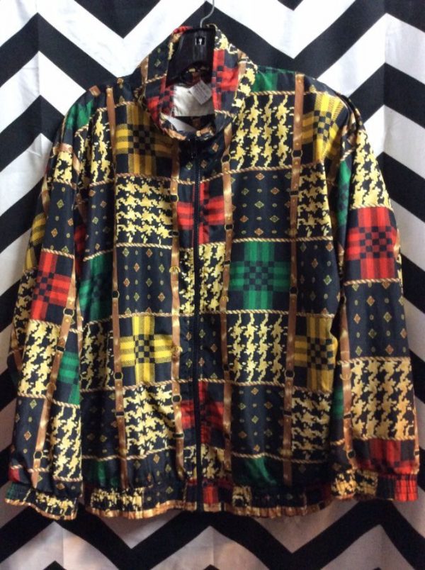 Bomber jacket, zip-up, ornate & houndstooth pattern in a checkerboard design print, black/red/gold/green, size M
