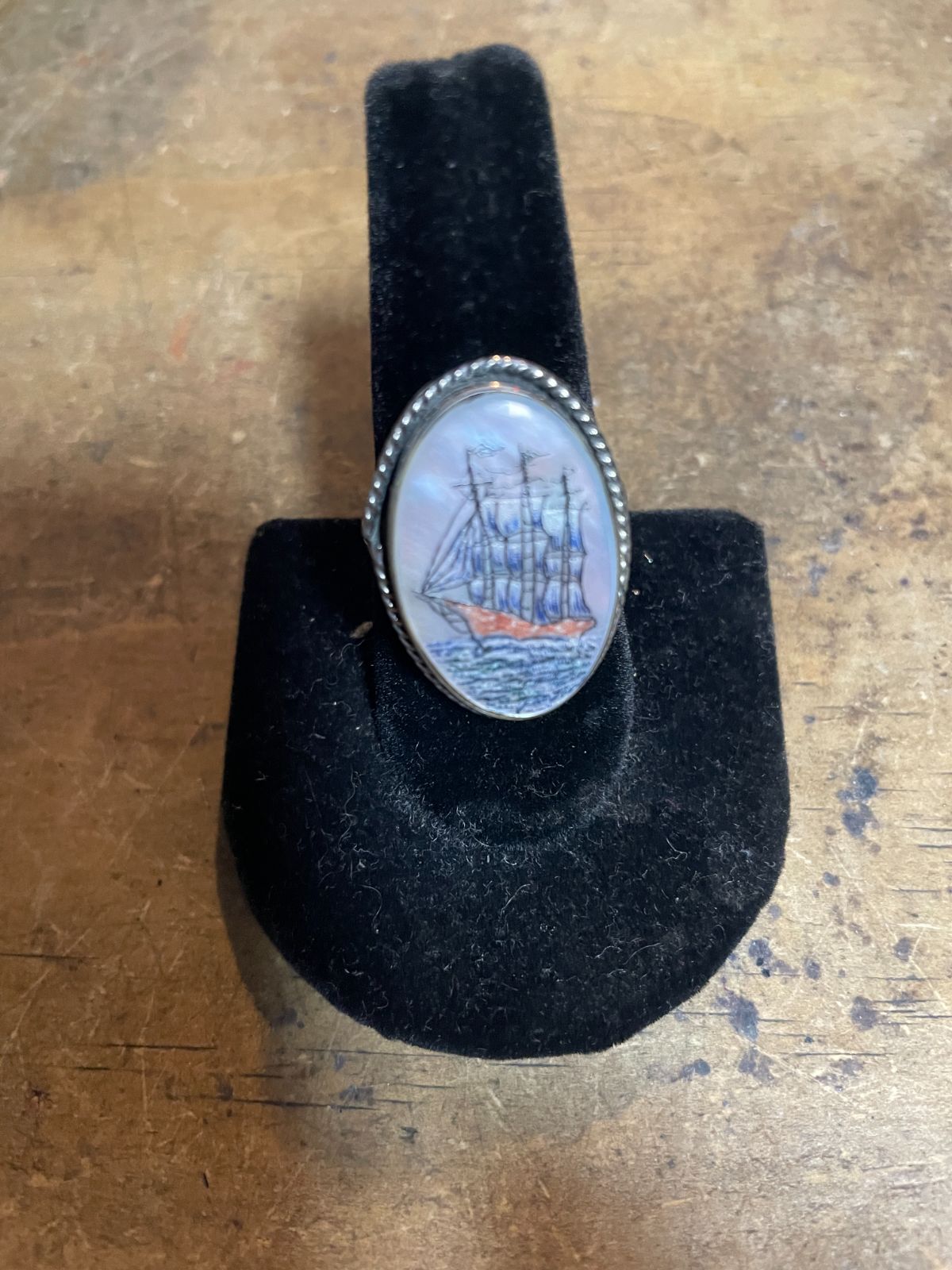 OVAL SHAPED MOTHER OF PEARL INLAY RING W/ SHIP DESIGN