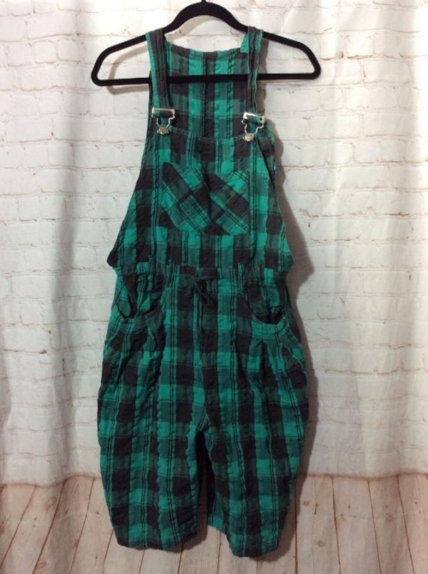 1990S RADICAL PLAID PRINTED OVERALL SHORTS DRAWSTRING CINCHED WASIT GREEN BLACK PLAID PRINT