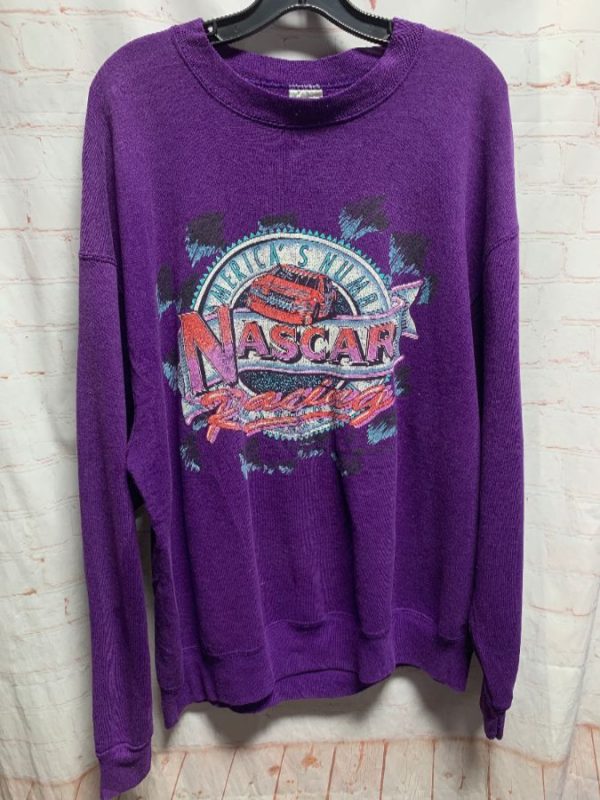 Fruit of the Loom sweatshirt, pullover, crew-neck, Nascar Racing, American’s Number 1 Motor Sport, screen printed front graphic, purple/blue/black/white, size XXL Oversized