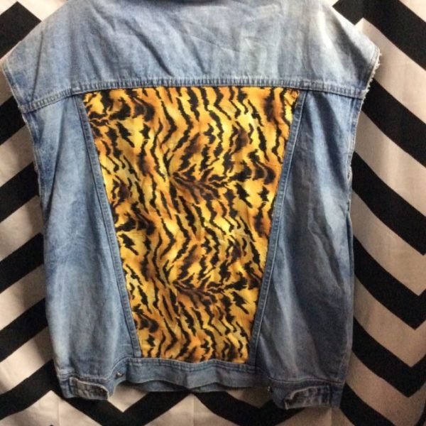 STAR DENIM VEST – BUTTON-UP – MULTIPLE PATCHES & STUDS ON FRONT – TIGER STRIPE PATTERN BACK INSERT