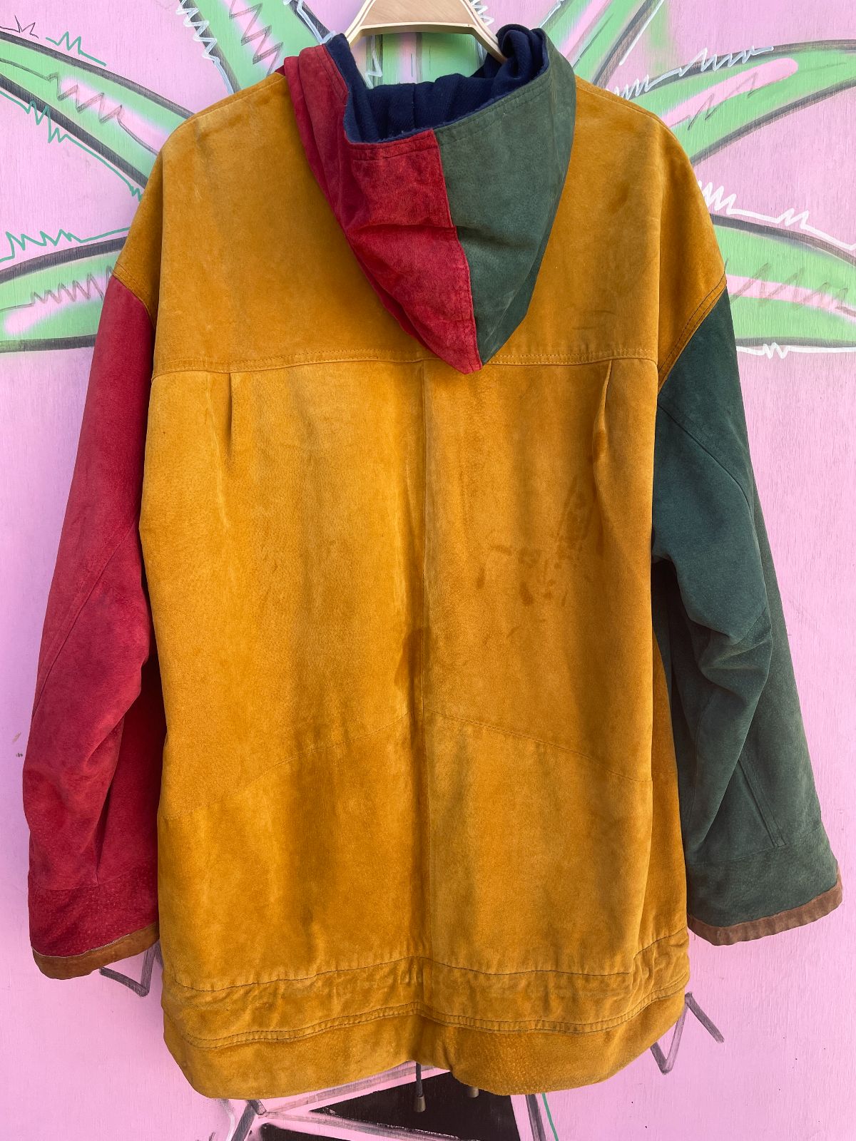 OVERSIZED HOODED COLORBLOCK SUEDE LEATHER JACKET
