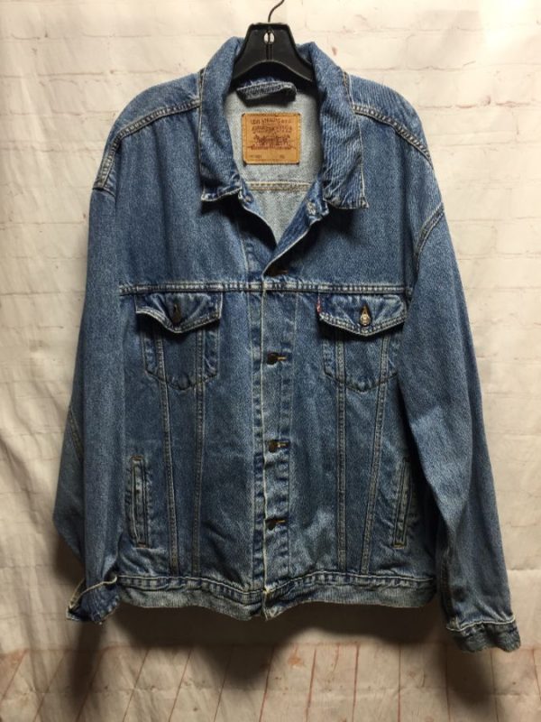 LEVIS DENIM JACKET W/ LARGE HARLEY DAVIDSON BACK LOGO PATCH