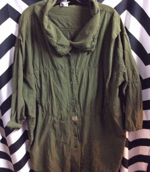 Military style shirt, button-up, draw string collar, olive, oversized