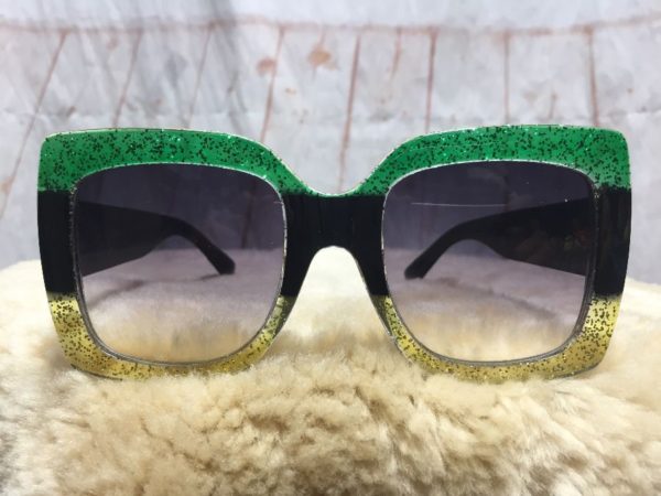 Retro sunglasses, oversized square shaped tricolor & glitter frames, wide temple pieces, cool colored gradient lenses, green/black/yellow/lavender, size one size