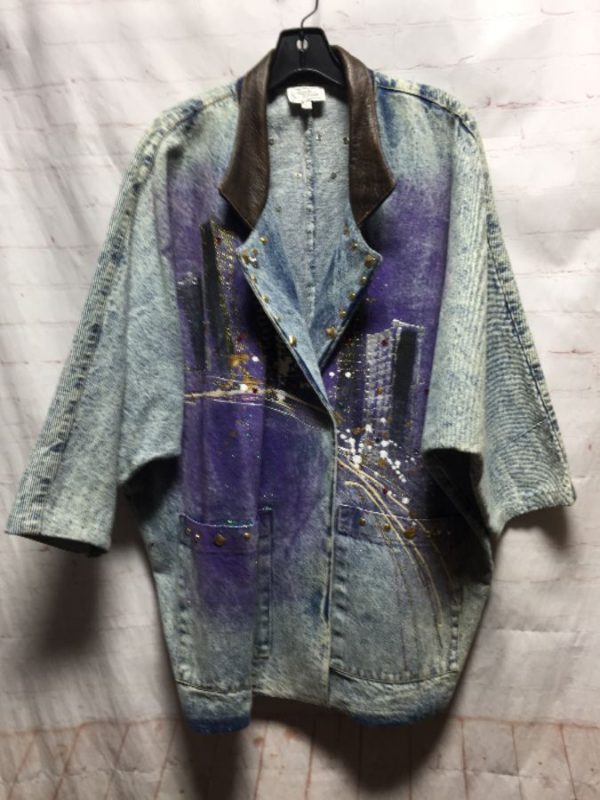 Charlie Casuals denim jacket, raglan sleeves, leather type collar, San Francisco, city scene painted designs on full front & full back, bedazzled embellishment, blue/purple/pink/white/gold/brown, size S oversized