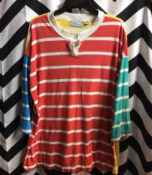 Shirt, mid length sleeve, button-up neck, color block, horizontal striped design, red/yellow/blue/green/white oversized