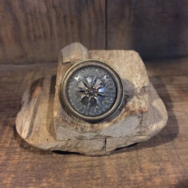 VINTAGE CONFECTION JEWELS RING, COCKTAIL RING, SNOWFLAKE DESIGN GLASS BUTTON, BRASS METAL MOUNTING, SILVER/BRASS, SIZE 8. OVERSIZED
