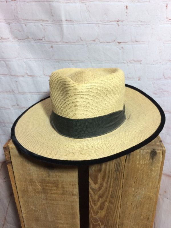 LARGE FLAT BRIMMED PANAMA STYLE WOVEN HAT VELVET TRIM LEATHER INTERIOR BAND