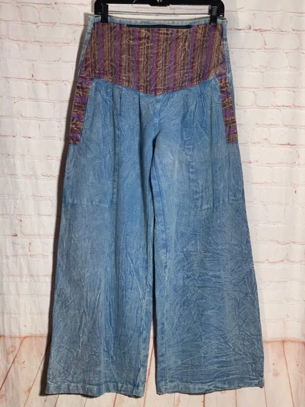 DENIM PANTS, WRINKLED, ELASTIC WAIST, WIDE LEGS, MADE IN NEPAL, STRIPED DESIGN ACROSS FRONT MID SECTION AND ON OPENINGS OF 2 LONG FRONT POCKET, SMALL ZIPPERED POCKET AT WAIST, MEDIUM-BLUE/PURPLE/BROWN/BLACK