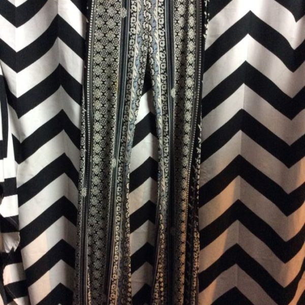 Pants, elastic waist, stretchy material, bell bottoms, ethnic-floral pattern in vertical striped design, white/blue, size S