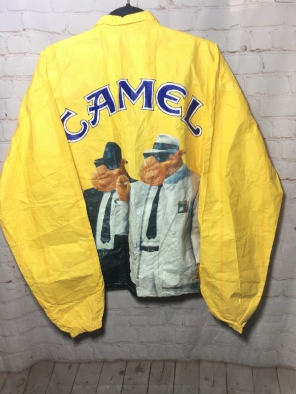 CAMEL WINDBREAKER JACKET, ZIP-UP, TYVEK BY DUPONT PAPER THIN FABRIC, SMALL SCREEN PRINTED LEFT CHEST LOGO & FULL BACK DESIGN OF 2 CAMELS SMOKING CIGARETTES & LETTERING, YELLOW/BLUE/BLACK/GRAY/TAN, SIZE XL