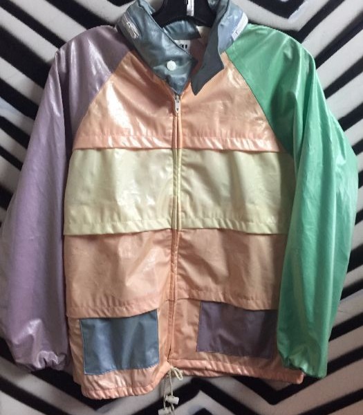 Rubberized windbreaker jacket, color block design, pastel green/violet/pink/yellow, size L