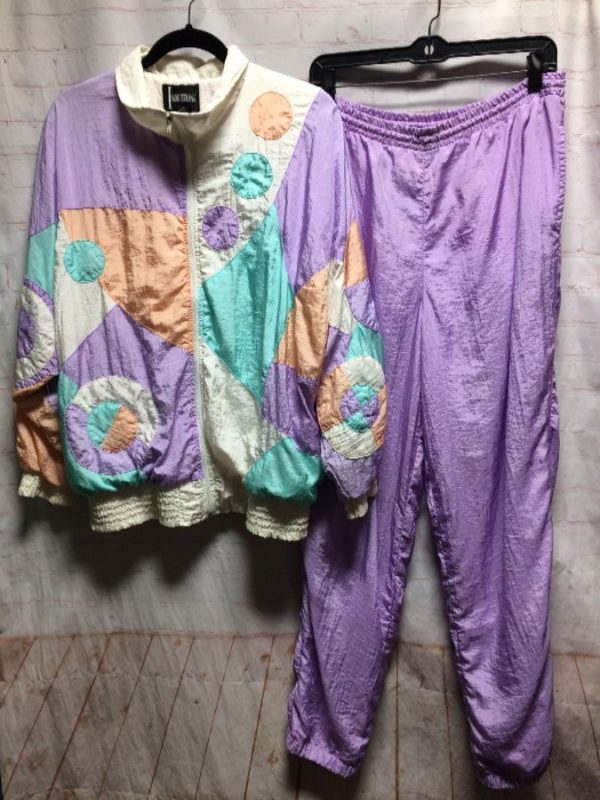 1980’s Indications windbreaker/tracksuit pant set, nylon, zip-up, elastic waist, circles pattern in an epic geometric color-block design, pastel colors, purple/blue/orange/white, size M
