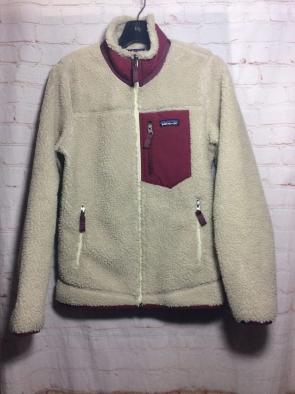 Patagonia jacket, polyester fleece, classic retro-x, zip-up, contrasting collar & left chest pocket, 3 zippered front pockets, creme-gray/burgundy, size XS