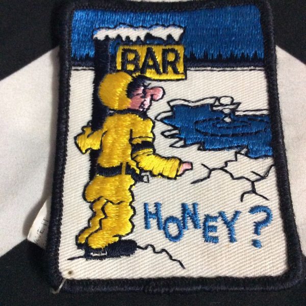 EMBROIDERED PATCH – BAR SIGN W/MAN YELLING HONEY? – BIG HOLE IN ICE