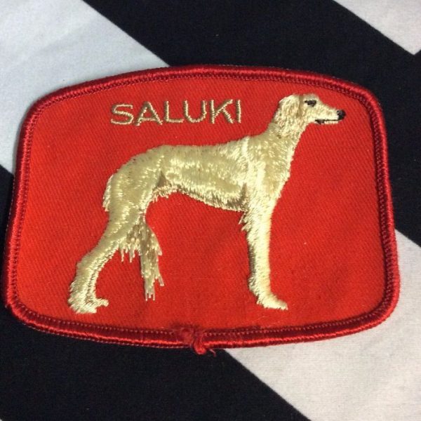 Embroidered patch, dog breed, Saluki, deadstock, old stock, red/tan/creme, size 3″