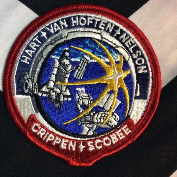 Patch, Space Lab, with astronaut names, Hart/Van Hoften/Neslon/Crippen/Scobee, red/blue/white/black, size 4″ large