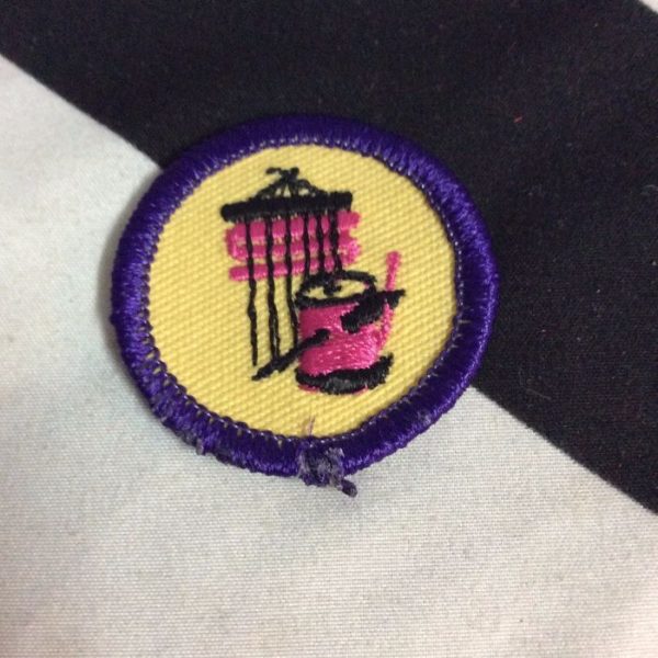 Embroidered patch, needle & spool of thread, old stock, yellow/pink/purple/black, size 1.5″