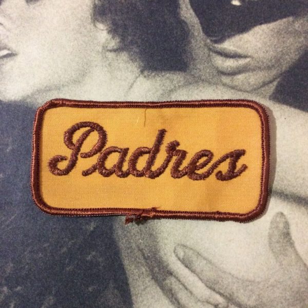San Diego Padres embroidered patch, with embroidered Padres lettering on rectangle patch, deadstock, mustard yellow/brown, size 2.25″ x 4″