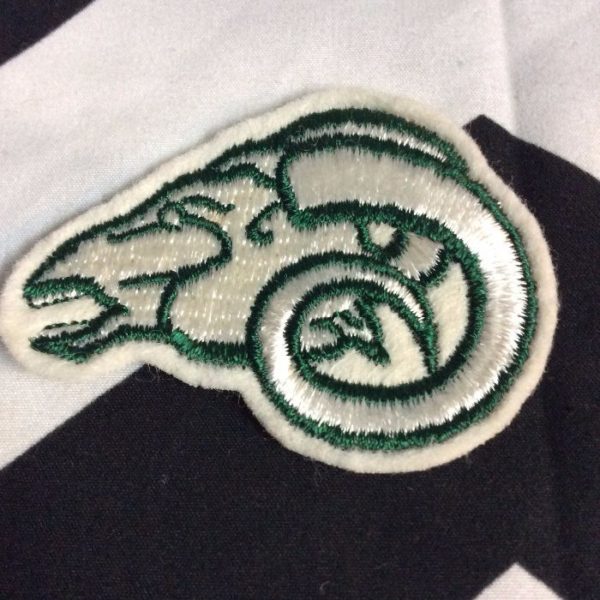 Embroidered patch, Rams head, side profile, old stock, white/green, size 2.5″