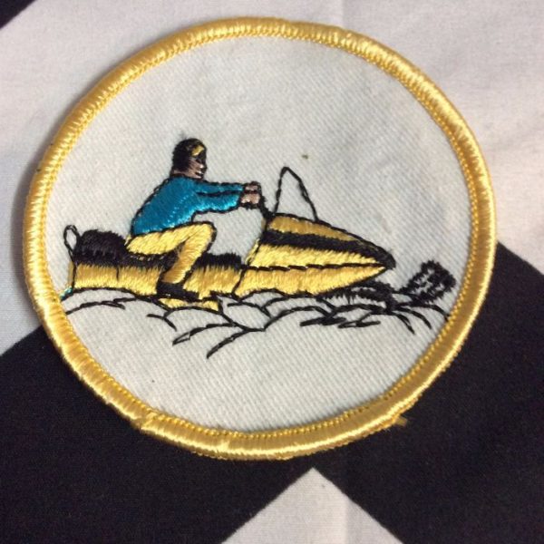 1970’S EMBROIDERED PATCH, SNOW MOBILE, ROUND SHAPE, OLD STOCK, WHITE/YELLOW/BLUE/BLACK