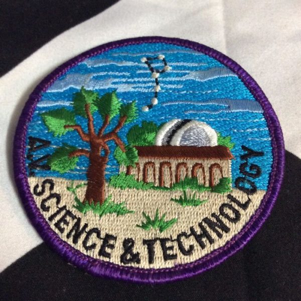 Embroidered patch, Science & Technology, observatory & palm tree, circle shape, old stock, blue/tan/white/green/black