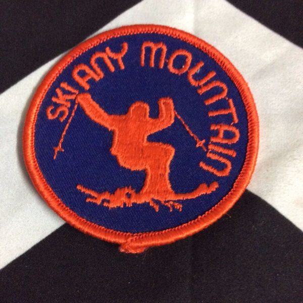 Embroidered patch, Ski Any Mountain, Skier hot dogging design, round design, old stock, navy/red, size 3″