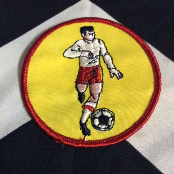Embroidered patch, soccer player with ball, round shape, old school, yellow/red/white/black, size 3″