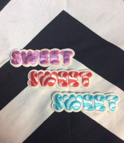 1980’s embroidered patch, SWEET, candy striped, old stock, multi