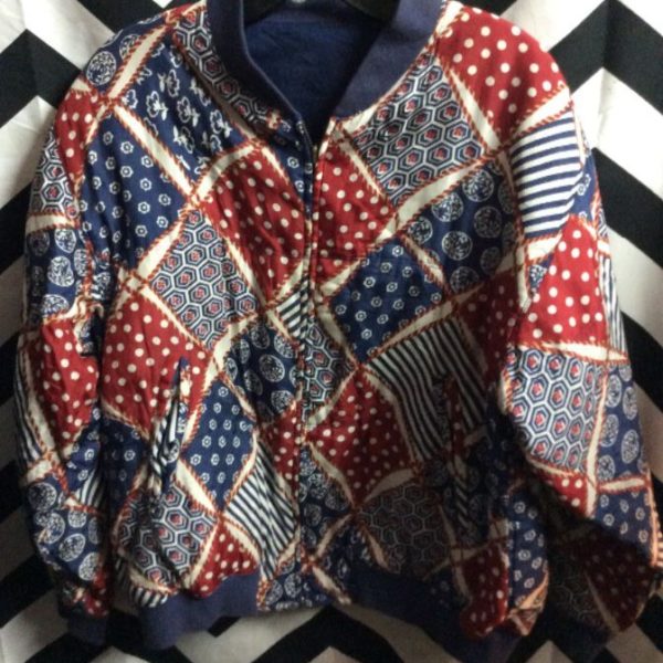 Bomber jacket, silk, cropped, patchwork design, blue/red/white, size M