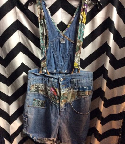 DENIM SHORTS – OVERALLS – LEATHER TRIM – DECORATIVE PATCHWORK POCKETS/TOP/STRAPS